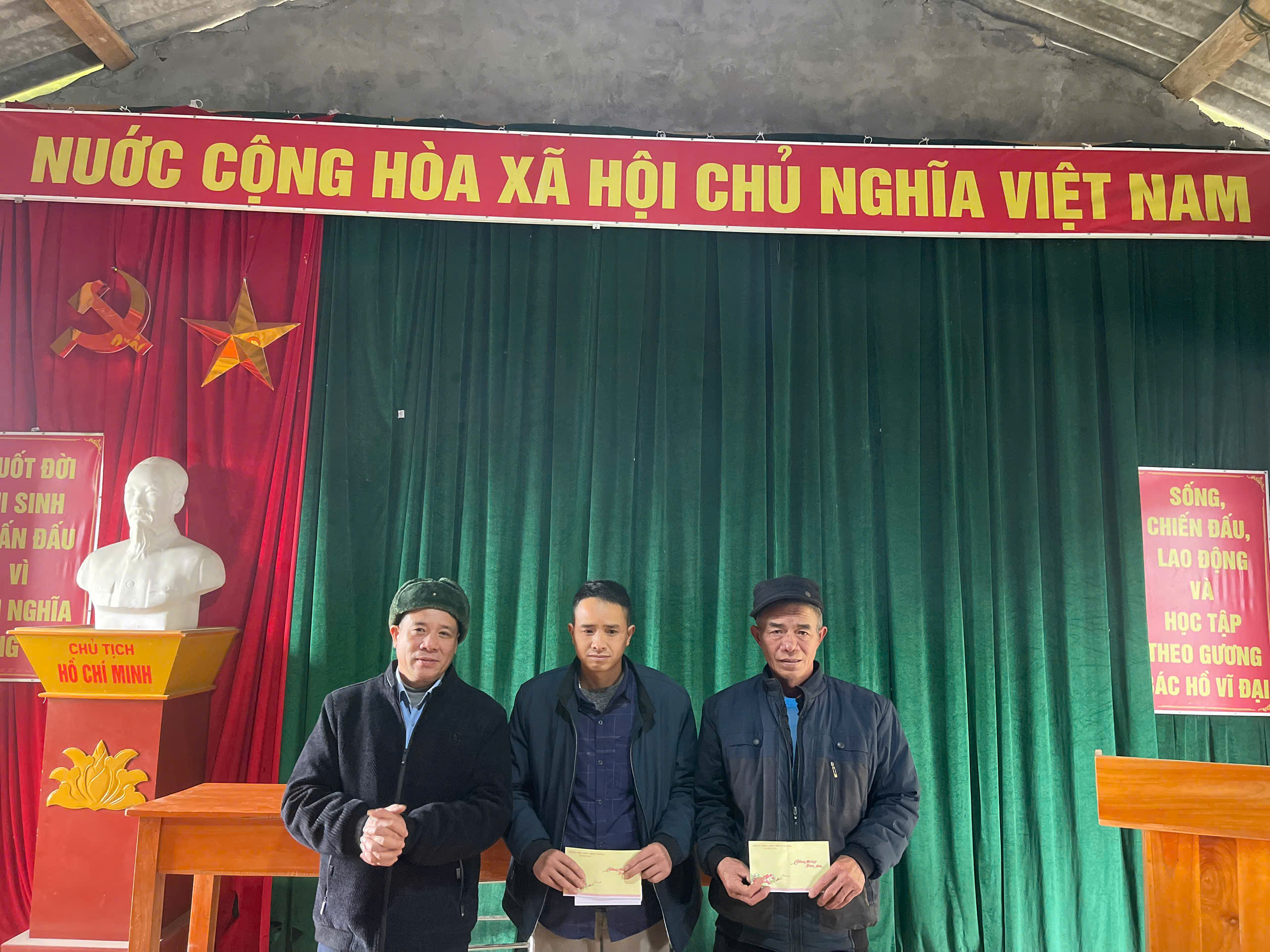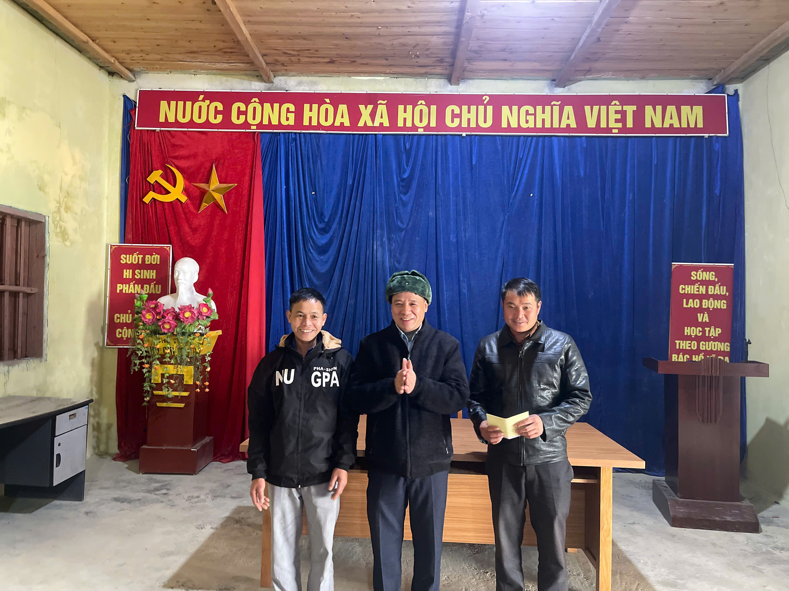 Đồng chí Hoàng Tiến Dũng - Bí thư Đảng ủy xã trao tiền hỗ trợ thôn